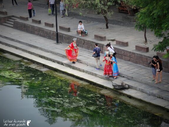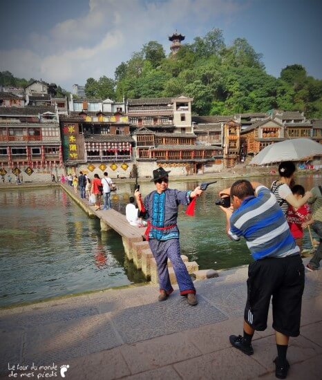 Fenghuang attire beaucoup de touristes mais la plupart sont chinois. Du coup, ça gène moins l’immersion. Je reste un petit occidental en Chine, entouré de chinois. Alors, à quoi on reconnaît-on un touriste chinois en Chine? Comme en France, il se sert beaucoup de son appareil photo et il aime être sur les clichés. Devant des locaux, en costume typique ou avec un déguisement de l’armée ou de mafieux, il adore ça. Alors on lui propose ce service.