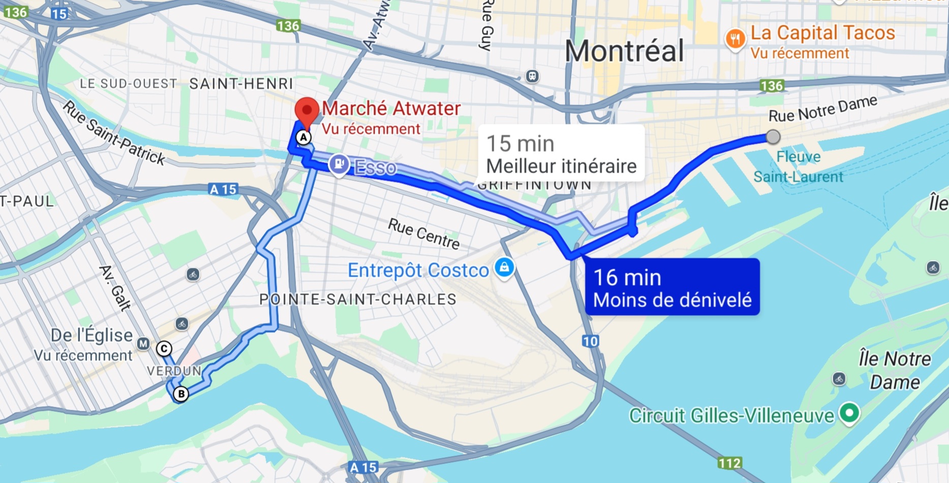 Un itinéraire qui sort un peu du commun avec un long pont spécialement dédié aux vélos qui traverse le fleuve Saint-Laurent sur une parfaite ligne droite de 2 kilomètres (l’Estacade du Pont Champlain a été créé à l’origine pour contrôler les mouvements de glace) et un passage sur le Circuit de course automobile Gilles-Villeneuve qui accueille la Formule 1 pendant le Grand Prix du Canada. Et pour le final, un beau panorama sur le centre-ville de Montréal (rendez-vous au niveau de la scuplture Trois Disques). Vous en verrez d’ailleurs un autre pendant le parcours, en arrivant sous le Pont Samuel-De Champlain, et vous pouvez en retrouver encore 4 autres dans mon article spécial pour observer la skyline de Montréal.