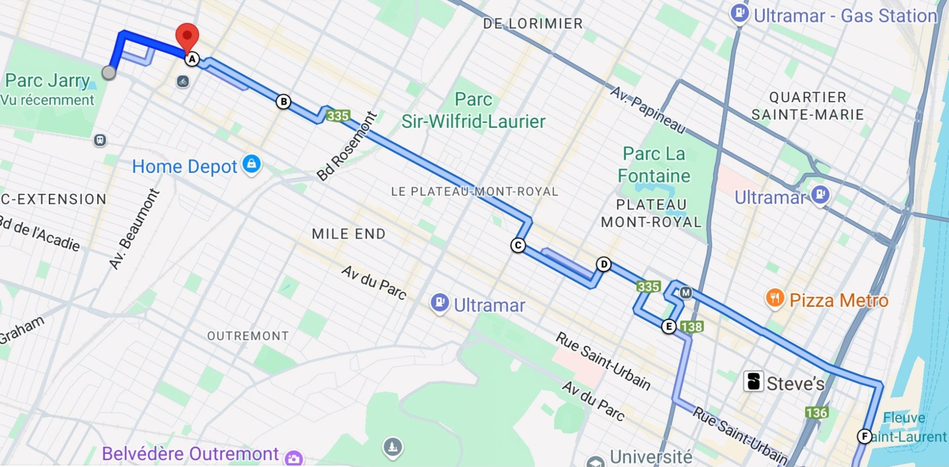 Cet itinéraire est plus coriace et à réserver aux plus sportifs car pour se rendre au niveau du Mont-Royal il y a pas mal de dénivelé. Mais le vrai point négatif de cet itinéraire, si vous optez pour les BIXI, c’est qu’il y a peu de stations à proximité. Si vous suivez mes conseils et prennez un abonnement BIXI comme je l’explique dans mon guide, vous aurez 45 minutes gratuites par session. Alors si vous faites un vrai tour à proprement parler cela ressemblerait à quelque chose comme ça, et en 45 minutes c’est compliqué d’ajouter des pauses ne serait-ce que pour profiter un peu des différents points de vue. Donc pour ne pas payer 20cts par minute supplémentaire et être tranquille, vous pouvez envisager une simple traversée du Mont-Royal en utilisant les deux stations opposée comme sur la photo ci-dessous. Si ensuite vous avez encore assez d’energie pour faire un aller-retour, vous n’aurez qu’a modifier les étapes pour découvrir d’autres belvédères ou points d’intérêts. Le plus célèbre est le Belvédère Kondiaronk mais rien que le Lac aux Castors mériterait une bonne pause lors de votre passage au Parc du Mont-Royal.