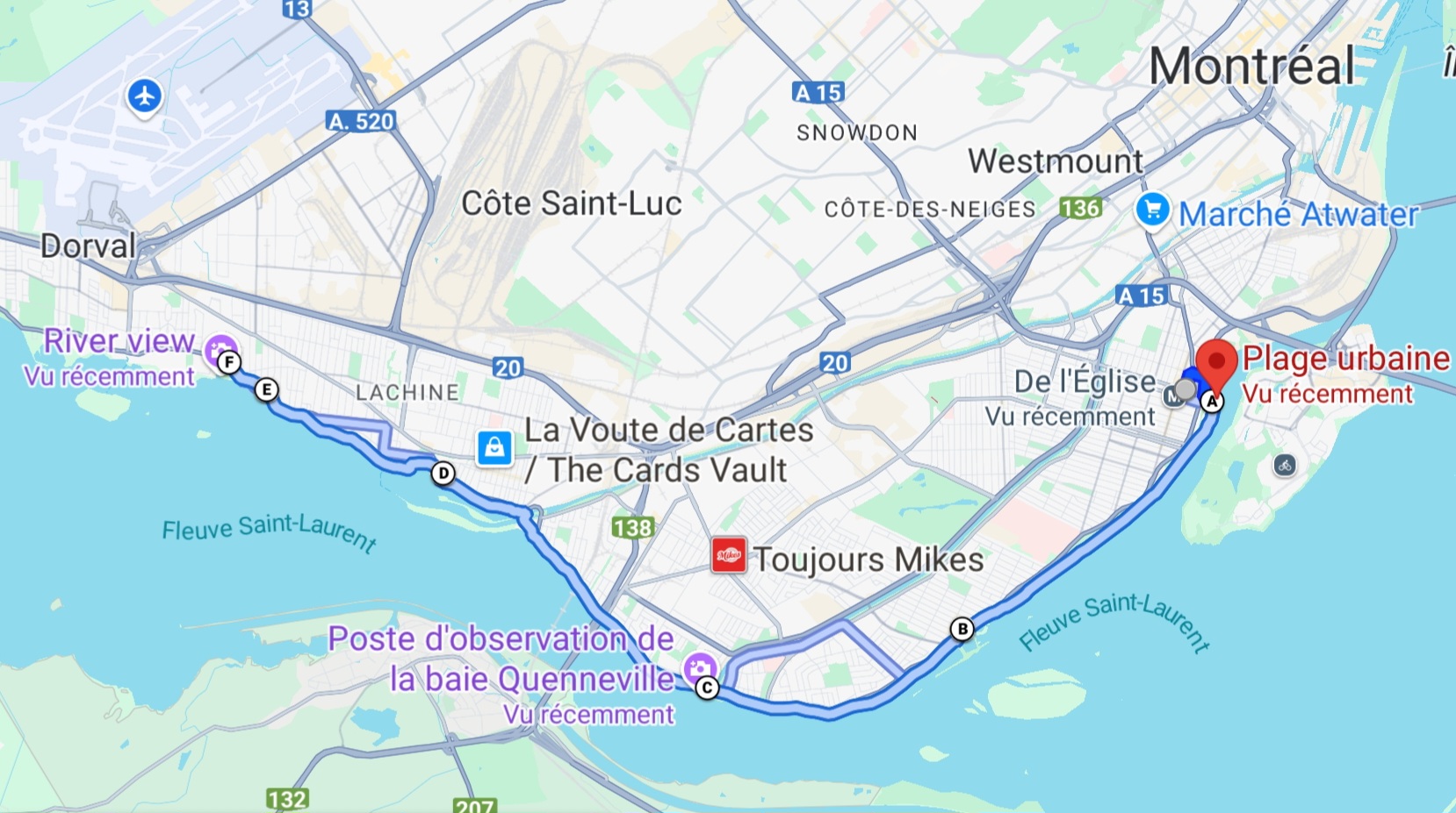 Cette fois on se retrouve face à un plus gros morceau, surtout si comme moi vous ne souhaitez pas faire le retour en transport en commun, l’itinéraire devrait faire alors pas moins de 35 kilomètres. Mais l’avantage, c’est que vous pouvez l’arrêter à tout moment pour faire machine arrière. C’est sans doute mon itinéraire préféré, rempli de stops et de panoramas, sur une piste parfaitement aménagé pour une superbe demi-journée de vélo, à votre rythme, puisqu’il y a là aussi de nombreuses stations BIXI le long du trajet. Un circuit qui se fait presque tout le temps sur une belle piste cyclable à l’écart de la circulation routière et au milieu de la verdure. Et comme le programme est chargé, avec notamment la Vague à Guy et le Parc des Rapides (qui se visite à pied) et des petites zones que l’on ne repère pas forcément en passant à vélo, j’ai repris en détails mon itinéraire dans un article spécial.