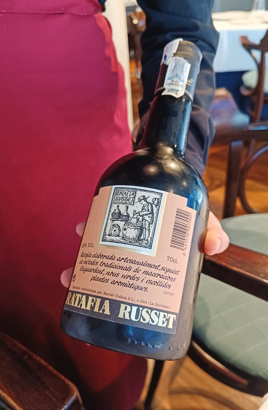 Premier dessert, le fameux pré-dessert,avec une salade fruits qui ne paie pas de mine mais où chaque fruits est parfait avec un sorbet mangue intense. Tout ça accompagné d’une boisson qui fait penser à du Jägermeister mais la version typique de la Catalogne, le Ratafia.