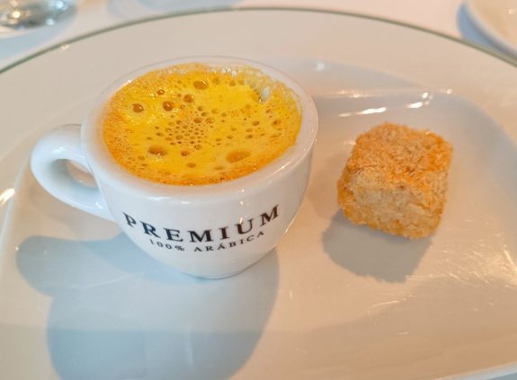 Après un amuse bouche sans prise de risque avec une vraie bonne soupe de poisson et une croquettes au jambon assez banale, on attaque avec le premier plat, une salade de crabe, des crevettes généreuses et une purée d’avocat savoureuse avec des sauces piquantes qui ne font pas de la figuration. Un beau visuel à la hauteur des goûts qui s’accordent très bien avec le vin blanc proposé.
