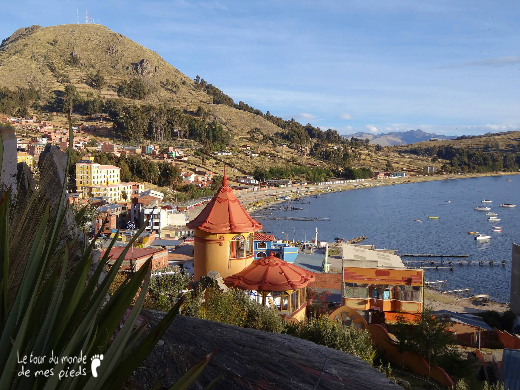 Copacabana (3800 m d’altitude), c’est une petite ville du genre très touristique mais qui reste très agréable à découvrir, à quelques kilomètres de la frontière avec le Pérou. On peut rapidement grimper l’une des deux collines qui l’entoure pour apprécier une très jolie vue et le coucher du soleil. Un bien bel endroit pour y poser ses pieds et prendre une photo souvenir (voir dernière photo de l’article).