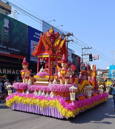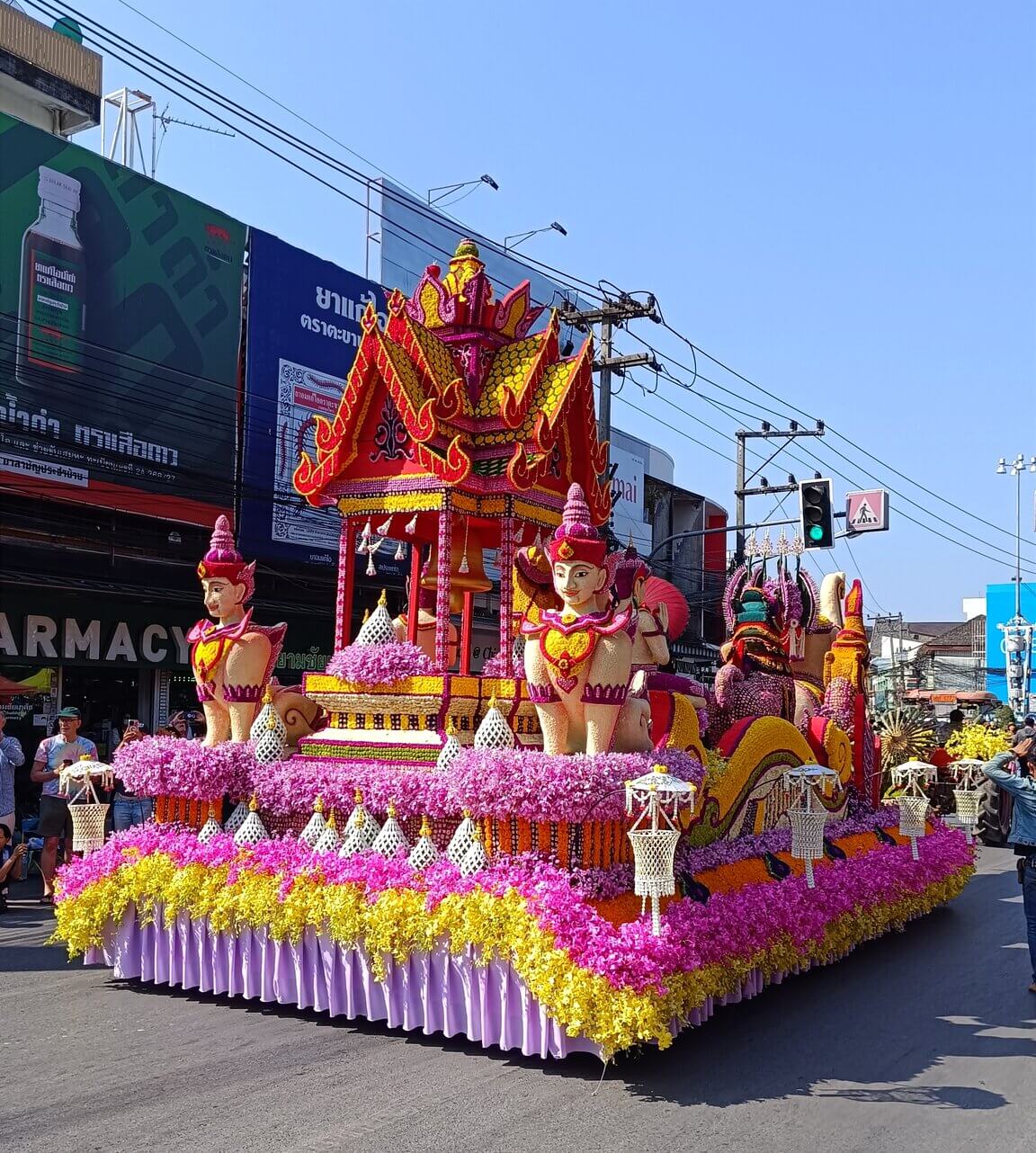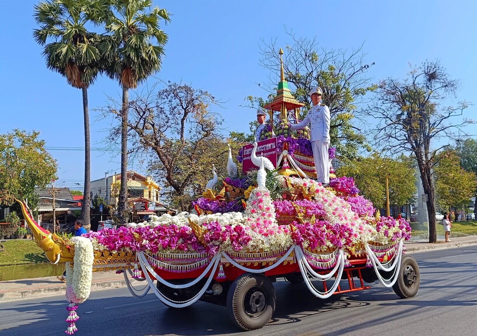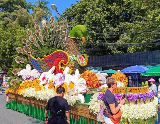 Une immense parade comme dans un parc Disney commence tôt le matin, vers 08h00, et dure jusqu’à 11h00 avec près d’une trentaine d’immenses chars fleuris, des défilés avec danseuses et fanfares et d’autres surprises comme des vélos fleuris ou des voitures anciennes. Le défilé part du pont Nawarat et se déplace lentement en passant par les routes Tha Pae, Kotchasarn, Chang Lor et Arak, avant de rejoindre les abords du joli jardin public de Nong Buak Haad pour terminer son parcours. Il n’est alors pas trop tard pour observer de près les différents chars à l’arrêt. Ils restent sur place toute la journée et seront même encore là le dimanche.