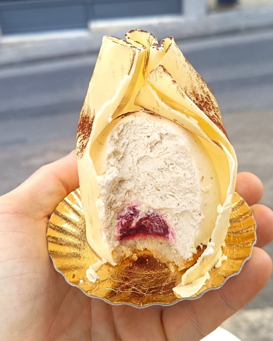 Derrière sa belle robe, faite avec un excellent chocolat blanc, se cache une petite compotée de framboises très intense et une grande partie crémeuse avec mascarpone et vanille à laquelle on peut reprocher un léger manque de saveur. Et peut-être qu’un biscuit un peu généreux ne serait pas de trop avec autant de crème.