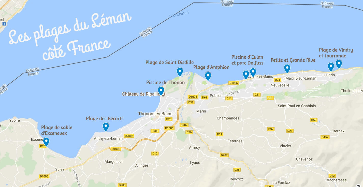 Aujourd’hui on commence par les plages autour du lac Léman côté français avec une dizaine d’endroits où se baigner, bronzer et, éventuellement, marcher. Toutes les plages ne sont pas toujours clairement indiquées sur Google Maps mais elles sont repérées dans les liens que j’ai ajoutés dans l’article ou sur la carte de la région.