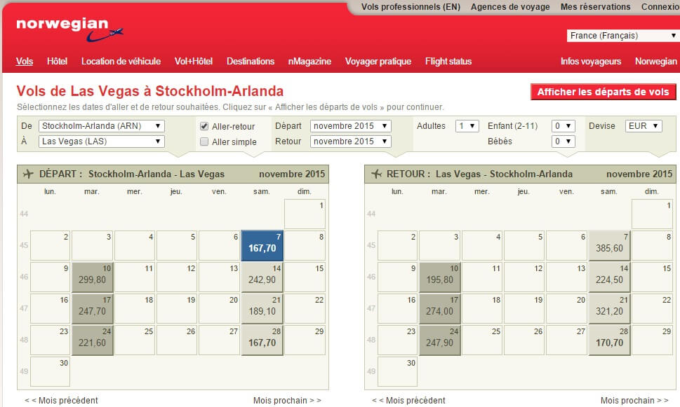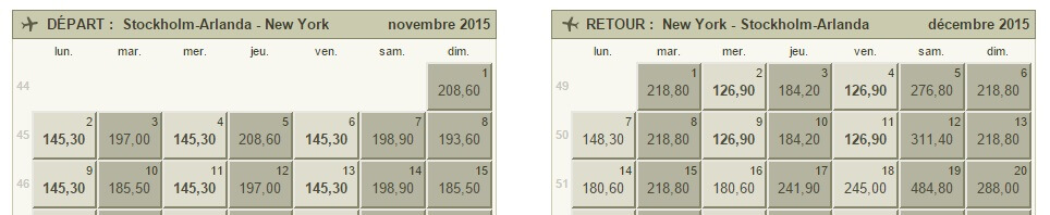Vous allez voir, c’est très simple avec la compagnie low-cost Norwegian. Il suffit juste d’un peu d’organisation. D’abord il faut choisir son vol (depuis Oslo, Stockholm ou Copenhague). Avec le calendrier de prix qui indique les vols les moins chers mois par mois c’est très rapide. Les vols vers les USA sont régulièrement à moins de 200€ l’aller. A partir de novembre et décembre vous pouvez trouver des vols A/R pour New-York pour moins de 275€ !