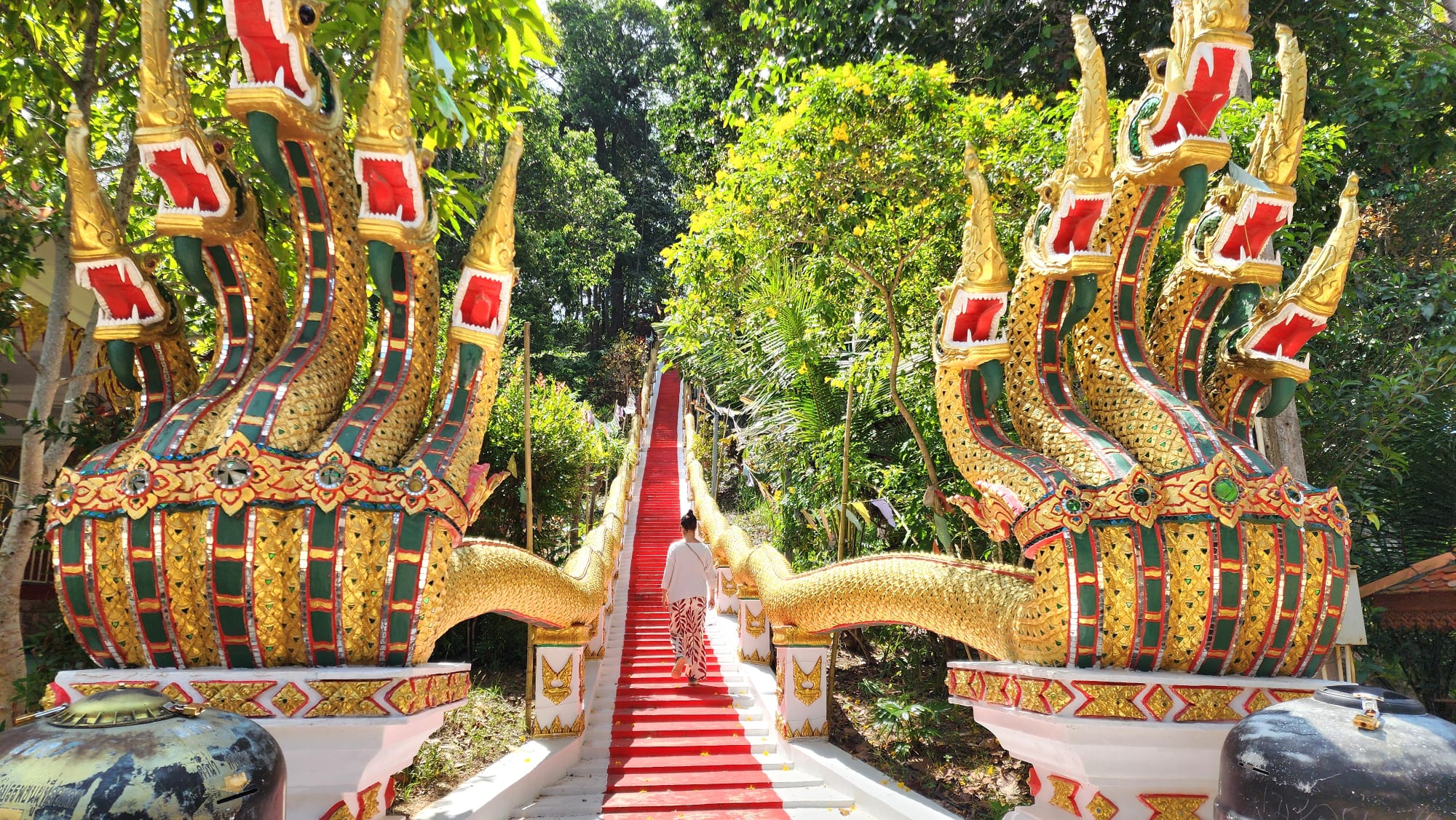 On revient légèrement sur ses pas pour ensuite traverser l’île en direction du Wat Maduea Wan. Un temple payant peut se trouver sur la route en option, mais le Wat Maduea Wan mérite vraiment l’arrêt.