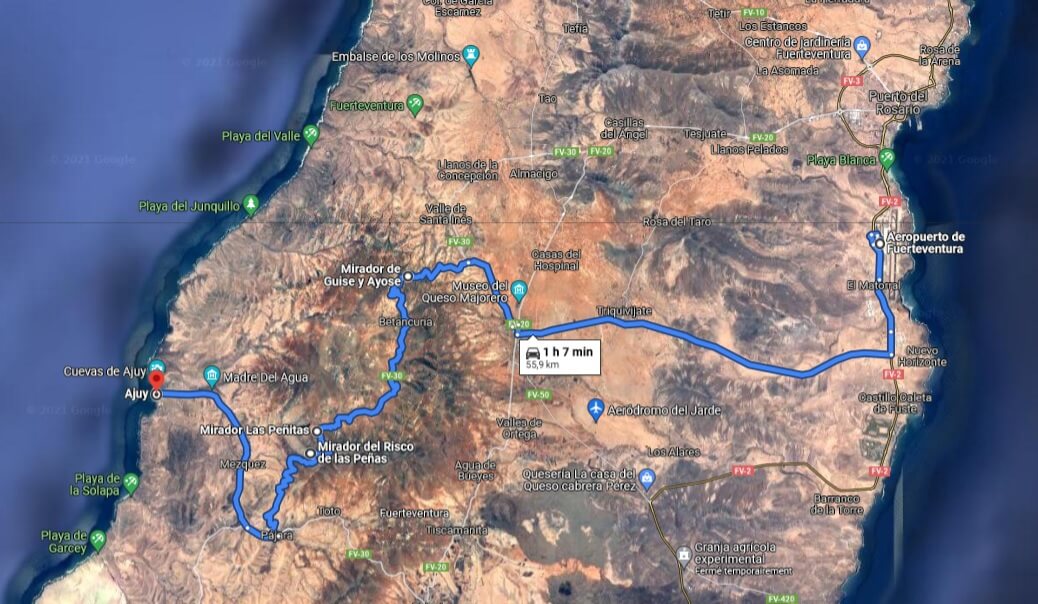 Vous pouvez retrouver l’ensemble des destinations de cet article directement sur une carte ainsi que des solutions pour se loger à Fuerteventura en fin de page.