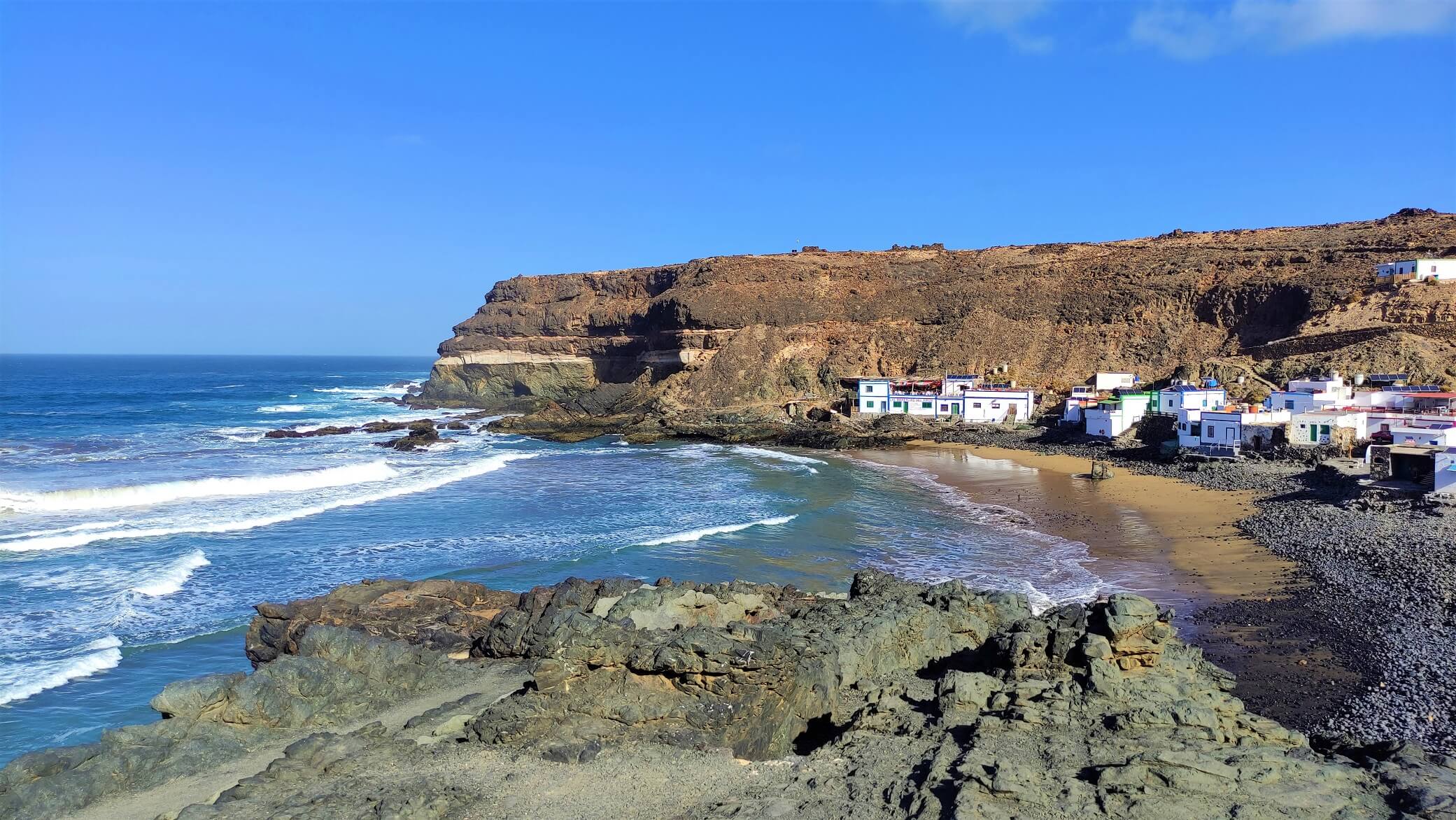 Avec son charmant petit village de pêcheur, sa plage de sable noir et ses impressionnantes grottes naturelles taillées dans les falaises, Ajuy fait clairement partie des incontournables à Fuerteventura. Un grand parking gratuit à l’entrée du village rend sa visite particulièrement simple. Plusieurs restaurants avec de la pêche locale et seulement deux ou trois appartements sont en location.